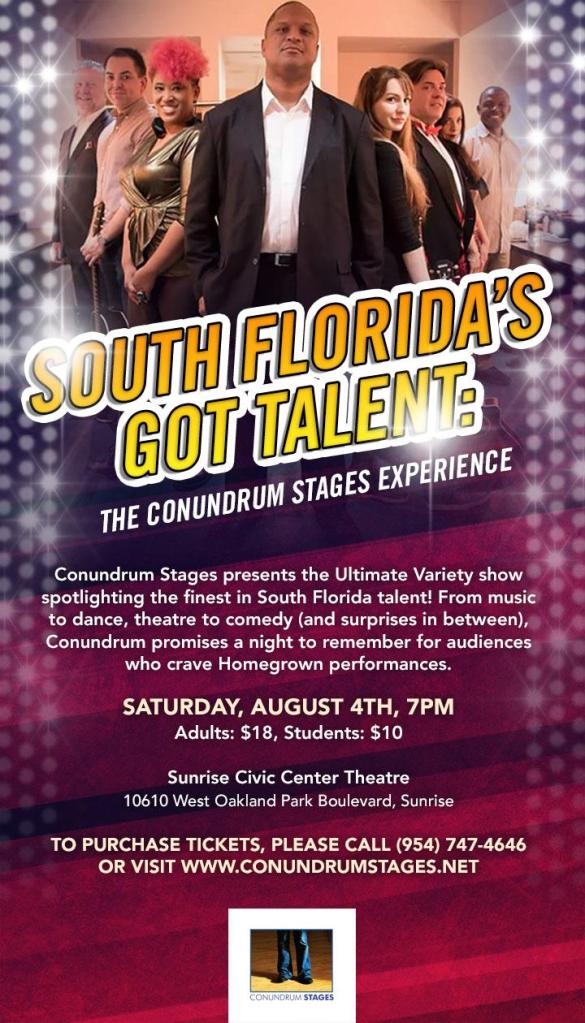 Conundrum Stages presents SOUTH FLORIDA’S GOT TALENT: THE CONUNDRUM STAGES EXPERIENCE – Saturday, August 4 26 Tuesday Jun 2018 Original size at 720 × 1260 ≈ Comments Off on SoFlaGotTalent Flyer