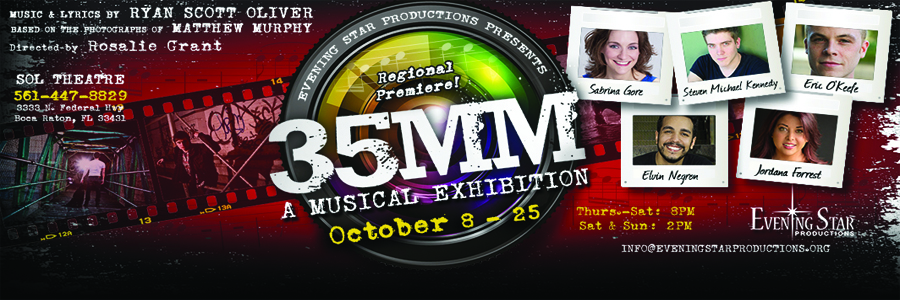 Evening Star Productions’ 35 mm: A Musical Exhibition will run from October 8 – October 25 (there will be a preview performance on October 8 at 8 pm) at Sol Theatre in Boca Raton. Tickets are $25 or $10 for students. Group rates are also available. Tickets are on sale now, and can be purchased at the Sol Theatre box office at 561-447-8829 or on line at www.eveningstarproductions.org. Sol Theatre is located at 3333 North Federal Highway in Boca Raton (33431).